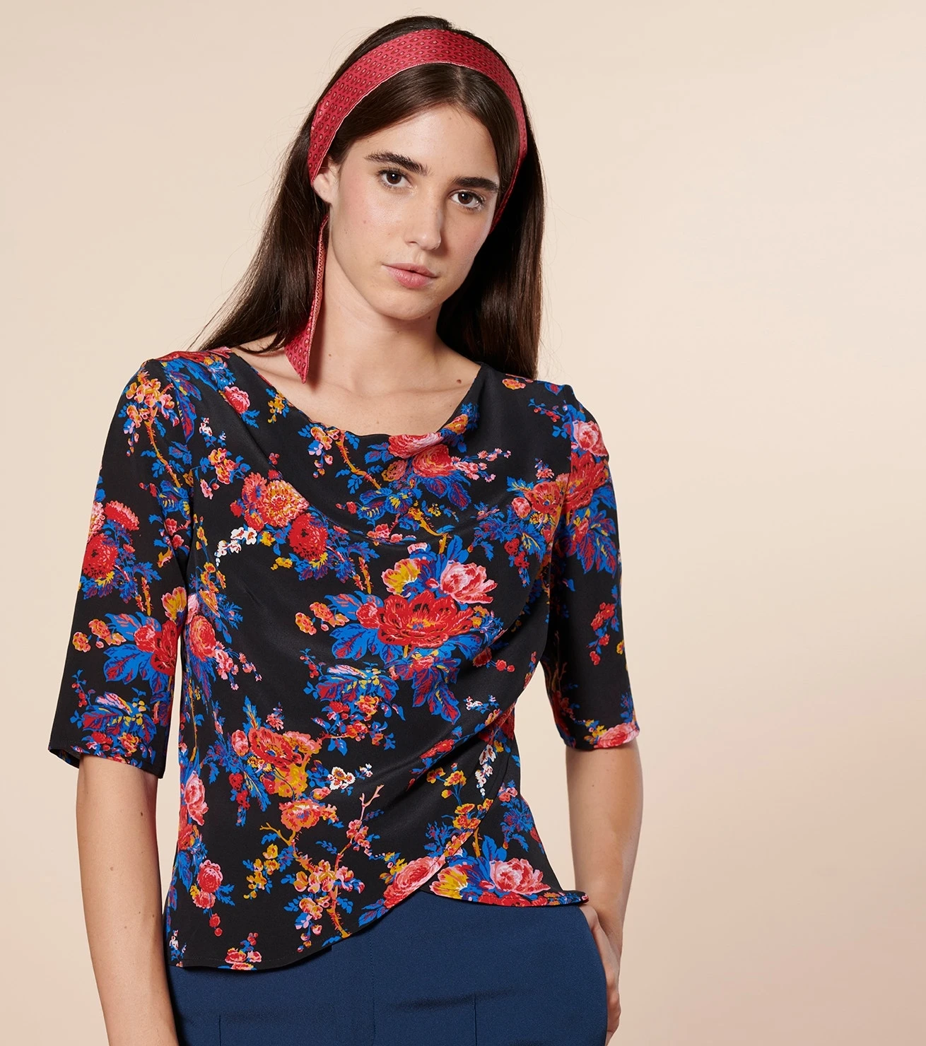 - Blouse drapée et fluide en crêpe de chine imprimé Jardins de Saint Rémy (100% soie)