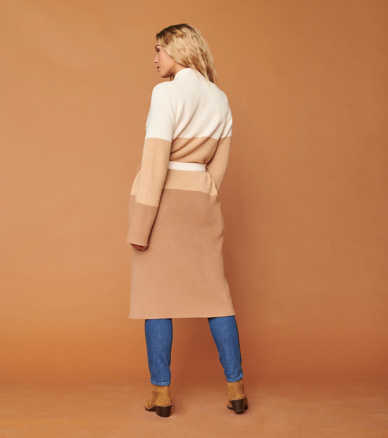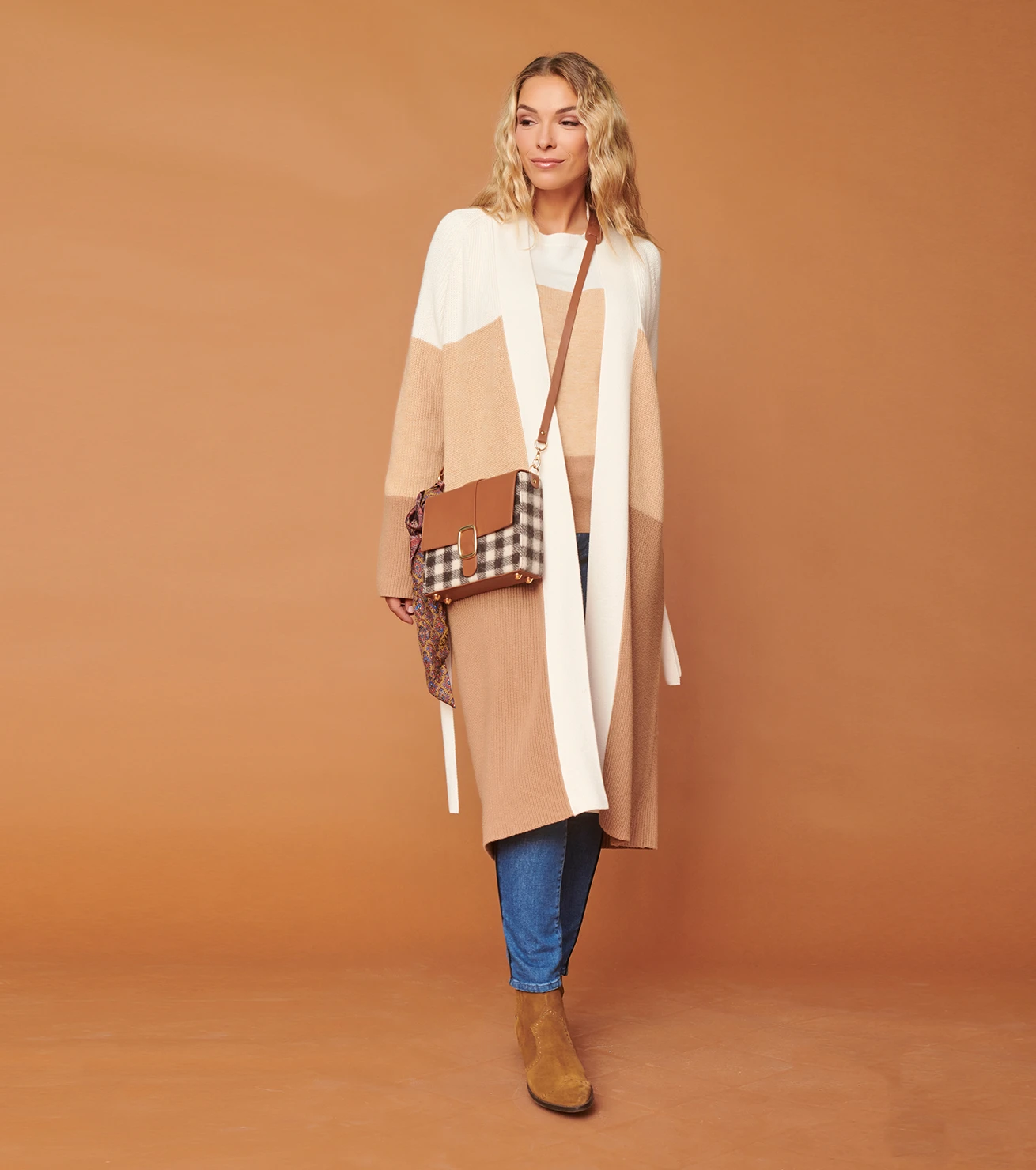 Gilet long Nore en laine et coton tricolore écru/beige/camel