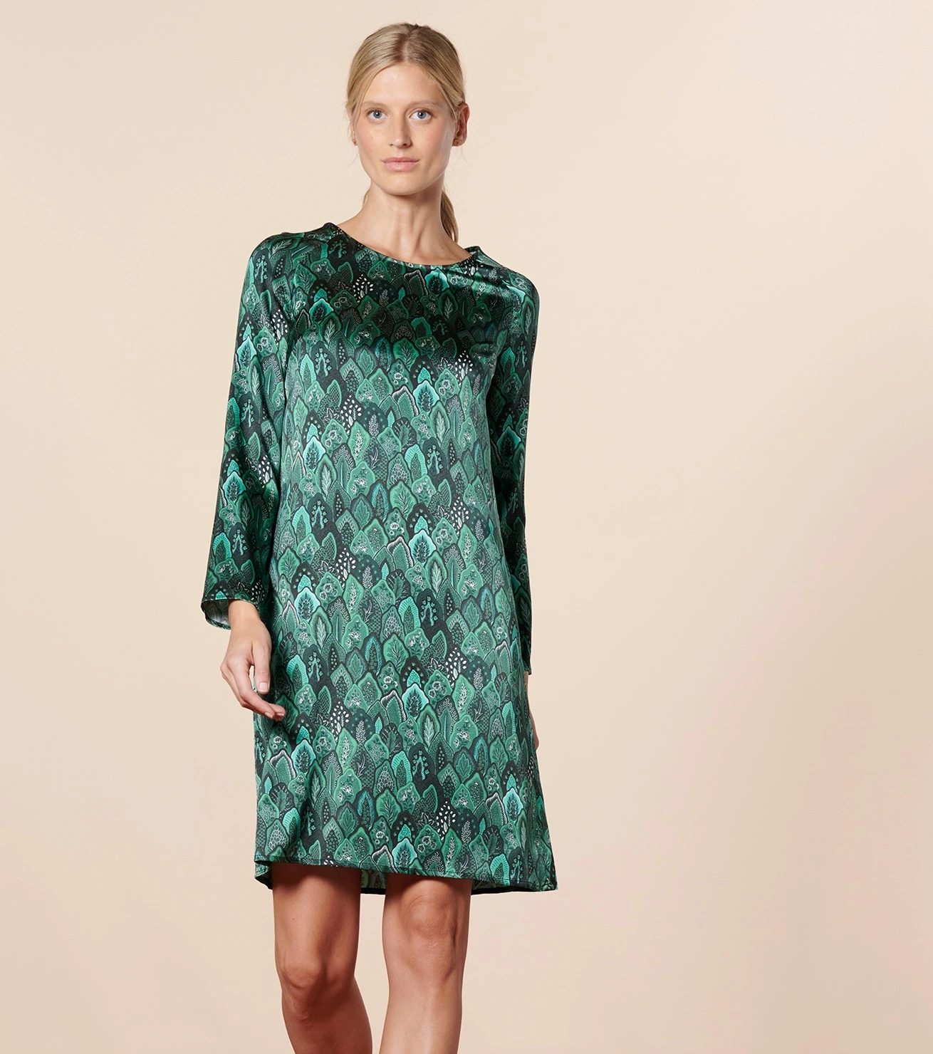 - Une robe droite courte en satin de soie