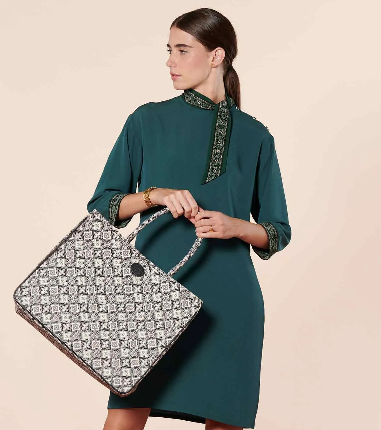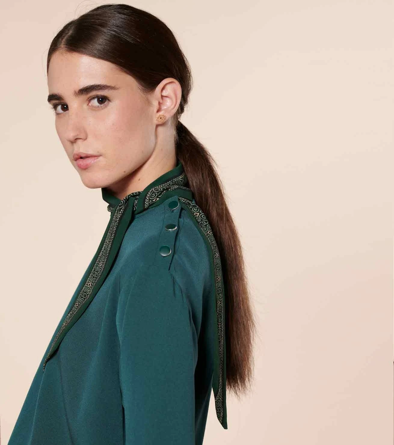 - Col lavallière noué au côté avec motif Frise Arabesque