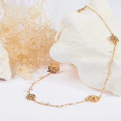 - Sautoir fine chaîne, habillée de médailles débossées motif Fleur d’Arles