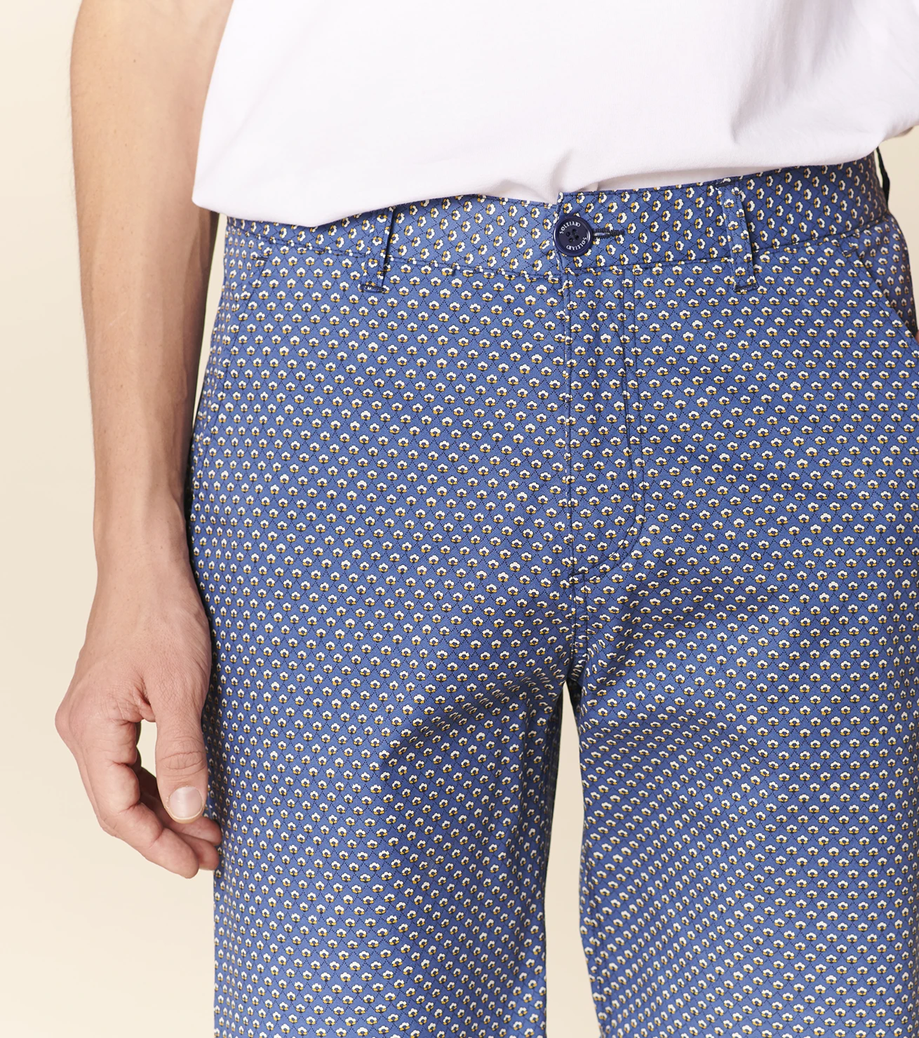 - Poches arrières passepoilées fermées par un bouton