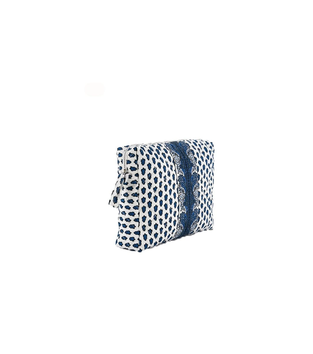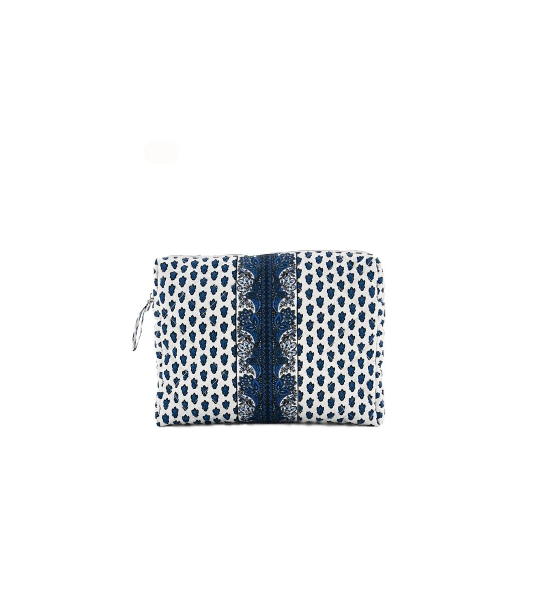 Trousse de toilette en coton matelassé vertical imprimé « La Mouche » coloris bleu fond blanc et double galon « Artichaud » Bleu