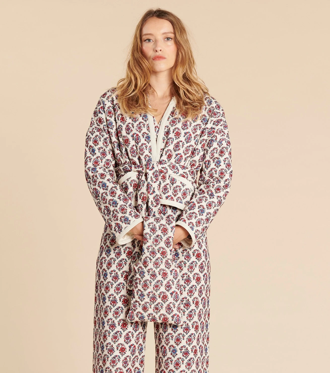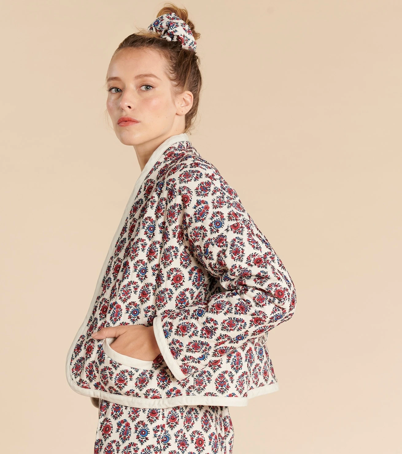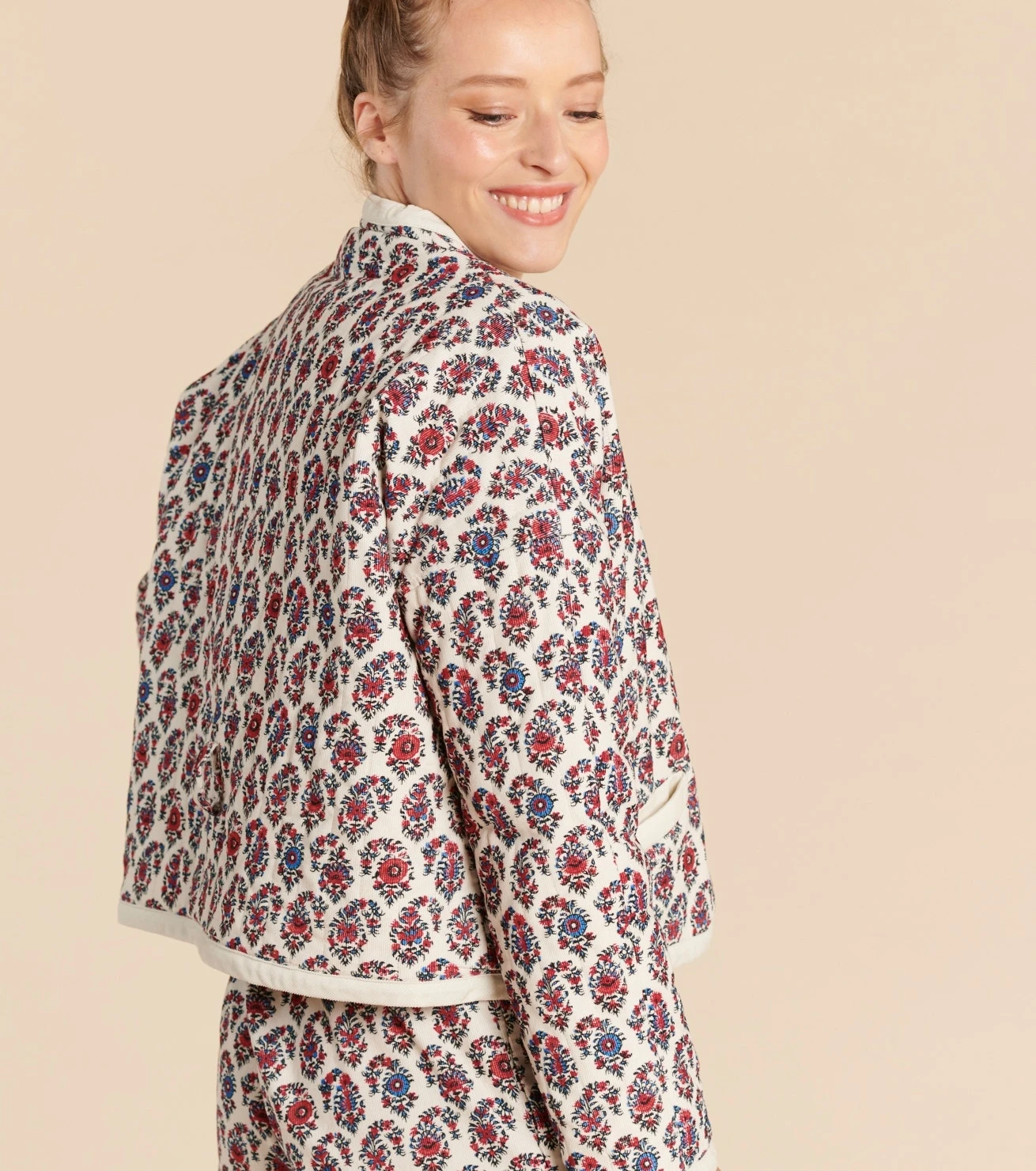 - Finition biais manches, col et bas de veste